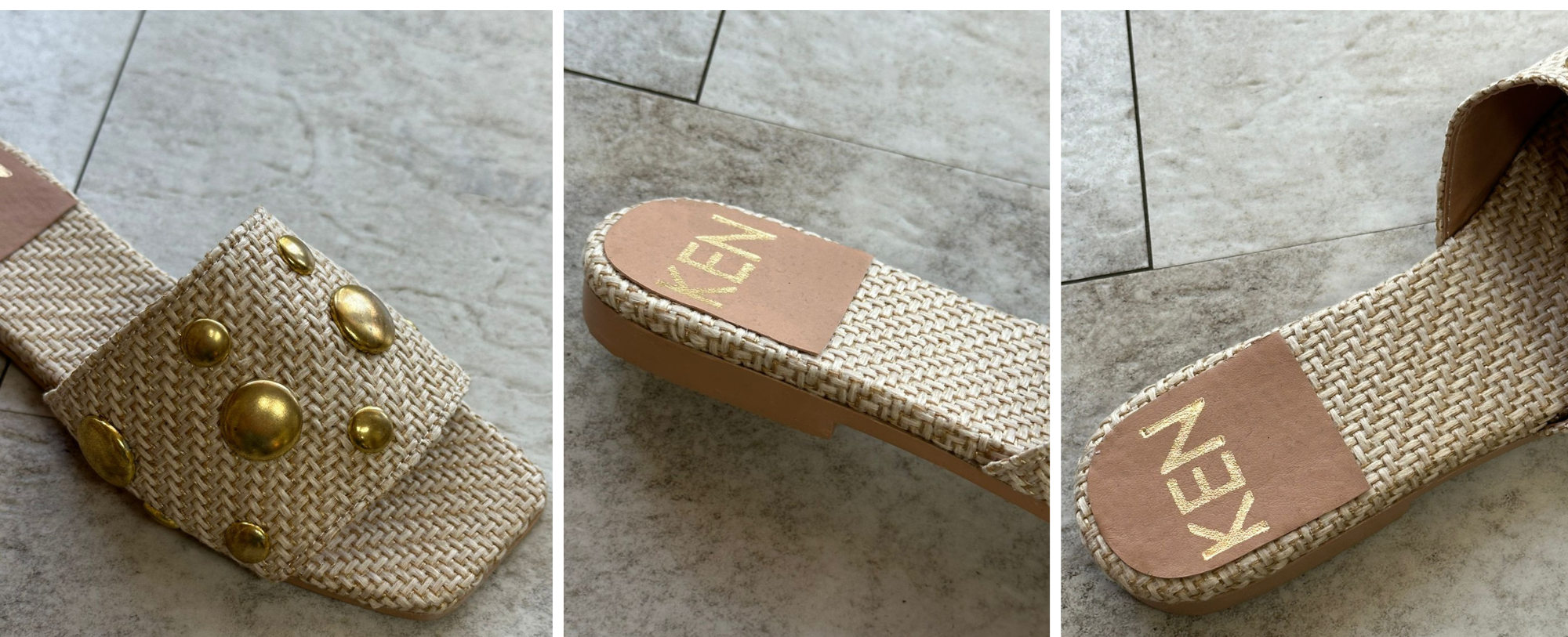 Chata confeccionada en rafia sintética con apliques de tachas metálicas con baño oro.