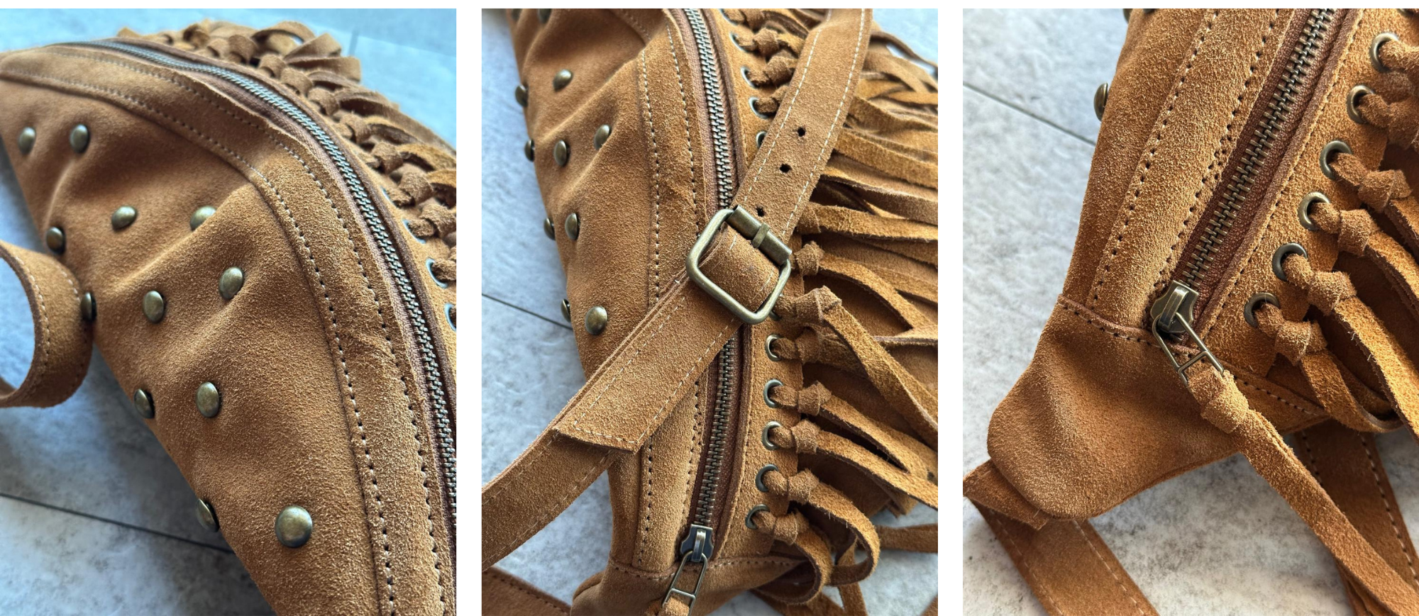 Riñonera de cuero vacuno gamuzado con flecos y tachas confeccionados en el mismo material.