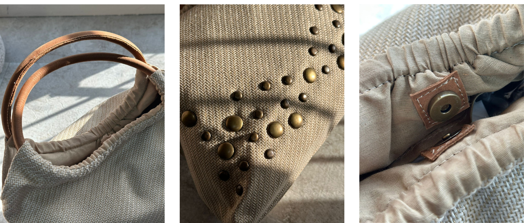 Cartera de rafia sintetica con tachas, manija de cuero vacuno.